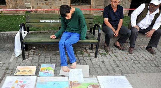 Hendikep paralize ruku, Serhat je pobijedio ustrajnim vježbanjem pisanja i crtanja stopalima, čime privlači veliku pažnju i izaziva divljenje svih prolaznika ulicom u kojoj crta i prodaje svoje radove.