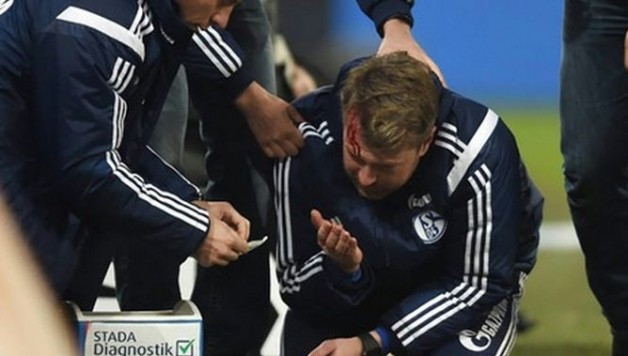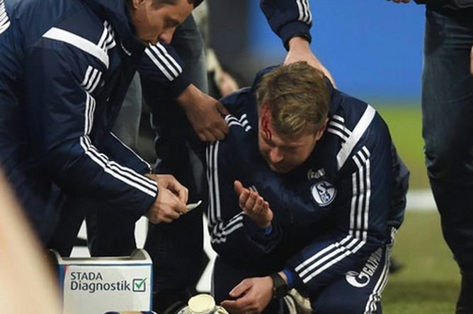 Sven Hübscher, pomoćni trener Schalkea, pogođen je željeznim upaljačem u glavu, te je zadobio duboku ranu na čelu.