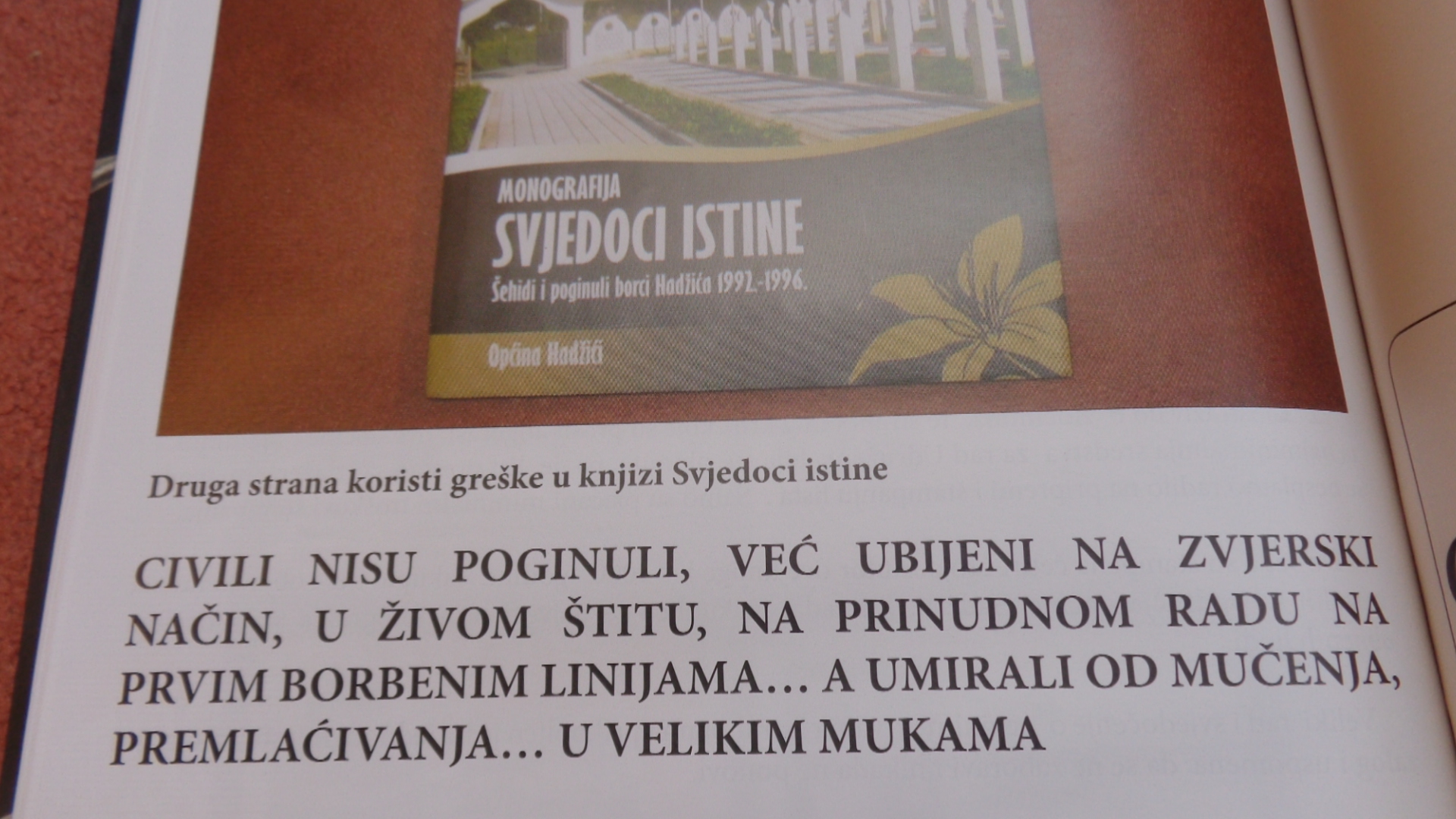 Zar nije čudno da se umjesto tužbe za mnoge zločine pišu parole zašto se ne sudi drugoj strani, a oni ni tužbu nisu ni podnijeli.Zar nije tužno kada pišu da se drugoj strani izriču izuzetno male kazne, a Općina Hadžići izdala knjigu „Svjedoci istine“, koja brani zločine s druge strane.Oni koji su ubijeni na mučki način, umirali od premlaćivanja, živ zapaljen u knjizi Vahida Alađuza piše da su nestali ili poginuli…Ova knjiga bila je najbolja odbrana Radi Veselinoviću, ova knjiga kao dokaz druga strana poslala u Hag…