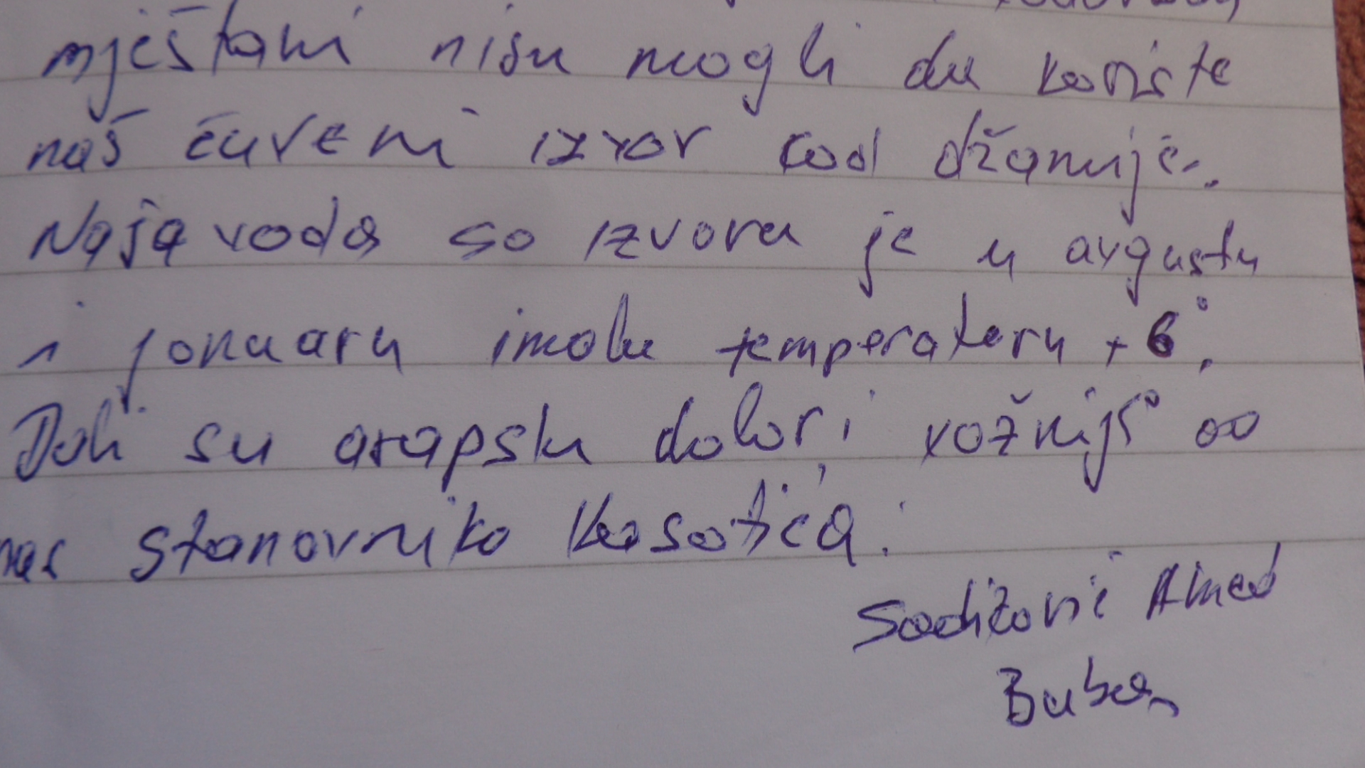 -Otvoreno sam pitao nadležne u općinu Hadžići da li su arapski dolari važniji od stanovnika Kasatića.Uništili su nam prirodni izvor, gdje je tempetura vode i ljeti i zimi bila ista – šest stepeni.Mrzlo pod nogama ili pekao zvizdan.Ovdje je temperatura vode uvijek bila ista.To je bio jedistven izvor.Izgradnjom arapskog naselja u Crepljanima previše su otišli u dubinu, izvor zagadili, i prema nalazu Zavoda za javno zdravstvo Kntona Sarajevo voda se našeg prirodnog izvorišta više nije za piće.Uništavaju nam prirodne blagodati, nas ništa ne pitaju,a niko za to ne odgovara, kaže Ahmed Sadiković Buba.