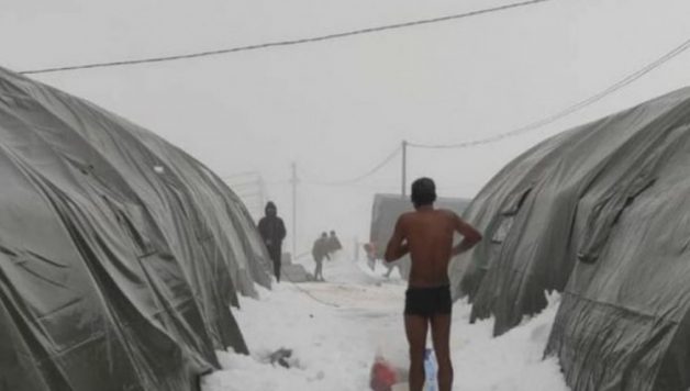 Iz Danskog vijeća za izbjeglice na svom Facebook profilu u opisu fotografije na kojoj se vidi migrant koji obavlja higijenu sa nekoliko boca vode, napolju, između dva šatora, dok stoji na snijegu