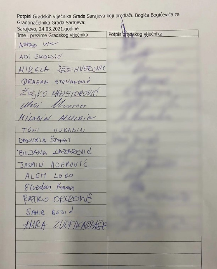 Potpise za izbor Jasmina Ademovića za predsjedavajućeg Gradskog vijeća i Bogića Bogićevića za gradonačelnika stavilo je 16 gradskih vijećnika iz ove četiri stranke. Većina u Gradskom vijeću Grada Sarajeva zahtijeva da se nastavak konstituirajuće sjednice, koja je prekinuta, zakaže za petak, 26. mart 2021.