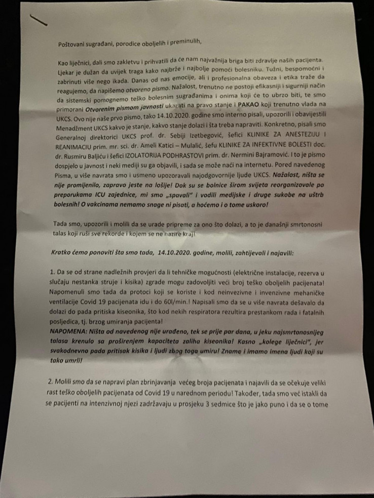 Dramatičnim pismom javnosti se obratila grupa ljekara s Kliničnog centra Univerziteta u Sarajevu (KCUS). Na početku pisma ljekari ističu kako su tužni, bespomoćni i zabrinuti više nego ikada, te da profesionalna obaveza i etika od njih zahtijeva da reagiraju.