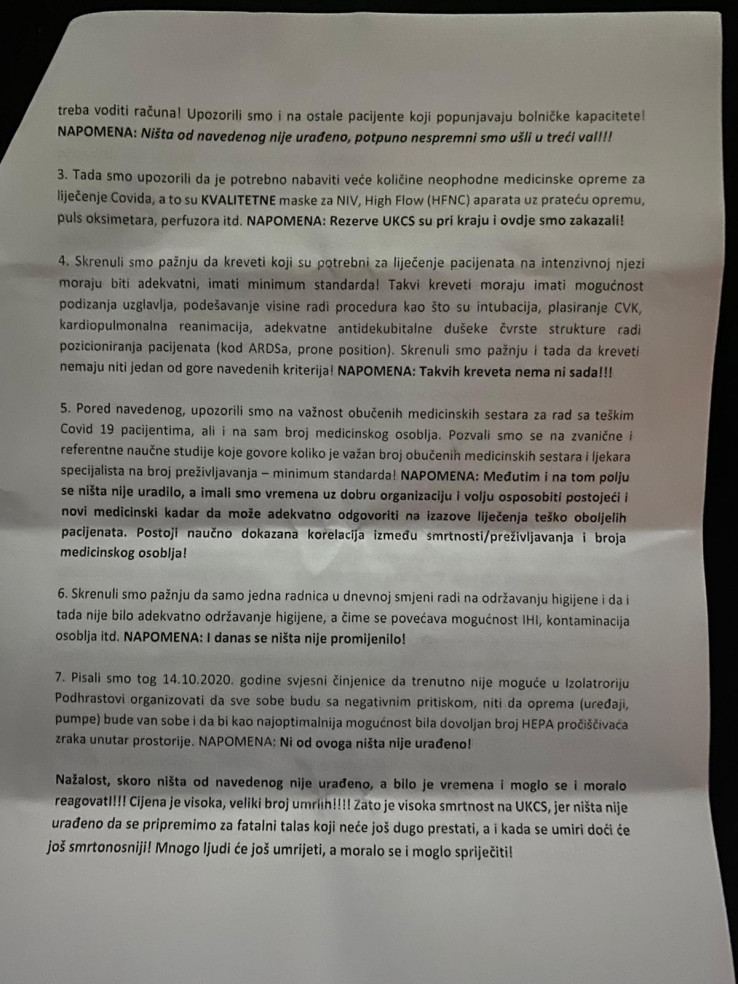 NAPOMENA: Ništa od navedenog nije urađeno, tek se prije par dana, u jeku najsmrtonosnijeg talasa krenulo sa proširenjem kapaciteta zaliha kiseonika. Kasno „kolege liječnici“ jer svakodnevno pada pristika kisika i zbog toga ljudi umiru! Znamo i imamo imena ljudi koji su tako umrli, navodi se u pismu.