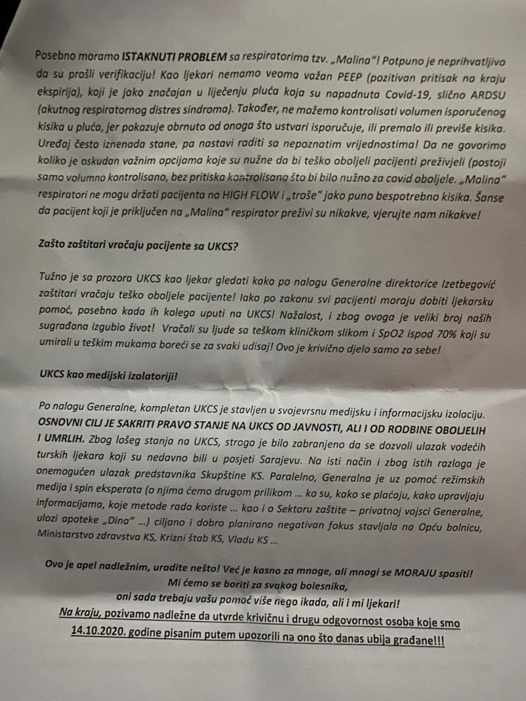 Posebno je alarmantan i zastrašujući dio pisma koji se tiče rada respiratora.