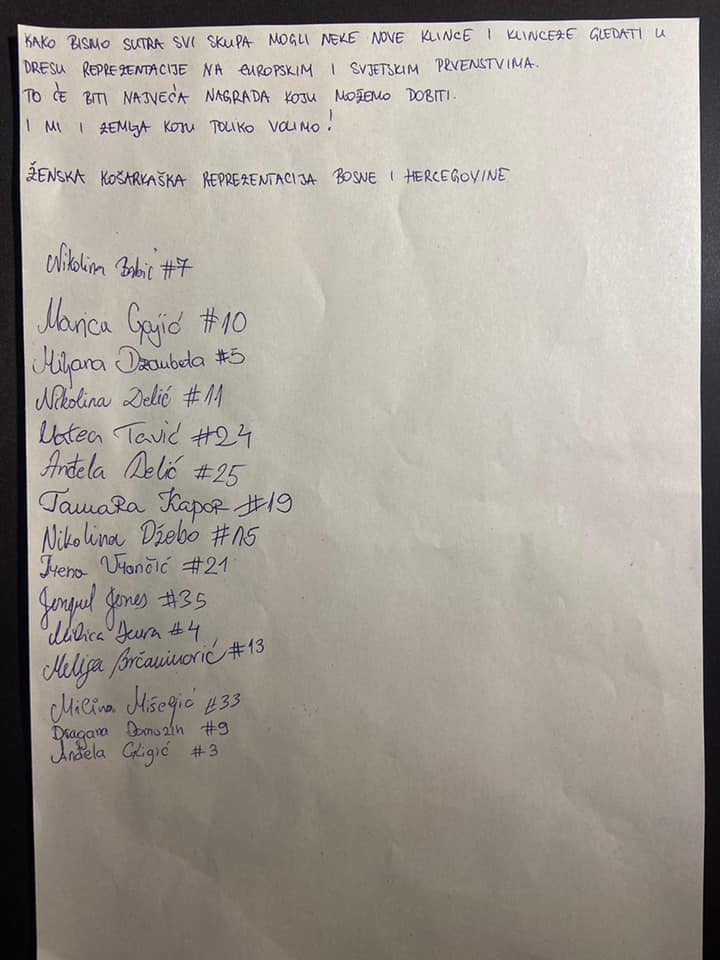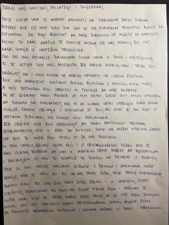 Prije svega vam se moramo zahvaliti na ogromnom broju poruka podrške koje ste nam slali dok smo se na Evropskom prvenstvu borile da ostvarimo što bolji rezultat za našu domovinu. Ne možete ni zamisliti koliko su nam značile te emocije kojima ste nas hranili, bili ste naša snaga u najtežim trenucima. Ovo što smo ostvarile poklanjamo svima vama u Bosni i Hercegovini, to je uspjeh svih nas. Zajednički, bez ikakvih podjela, kako i treba biti.