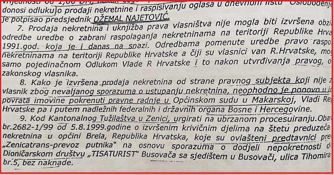 „Kod Kantonalnog tužilaštva u Zenici urgirati na ubrzanom procesuiranju o izvršenim krivičnim djelima na štetu preduzeća i prodaji nekretnina u općini Brela, Republika Hrvatska, koji su ovlašteni predstavnici „Zenicatrans-prevoz putnika“ na osnovu sporazuma o dodjeli nepokretnosti dali „D.D. Tisaturist“ Busovača bez naknade;“