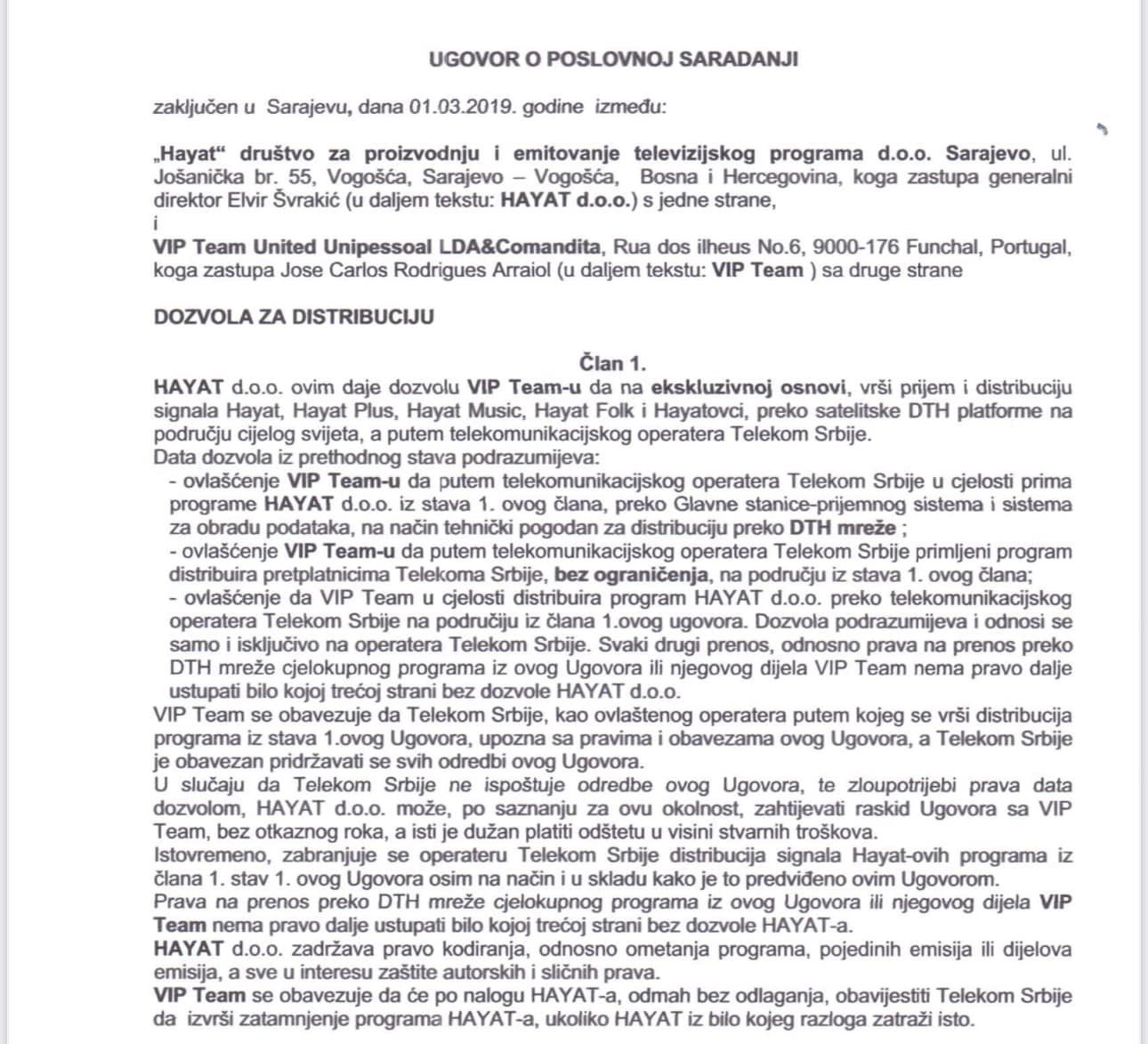 Hayat je potpisao najmanje 3 ugovora sa istom kompanijom. O toj kompaniji kao posredniku koji u ime Telekoma Srbije kupuje ekskluzivna prava na televizijske kanale iz BiH, naveo je Konaković