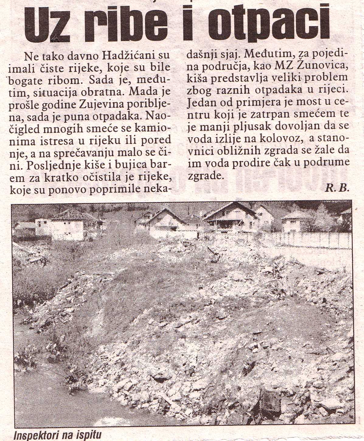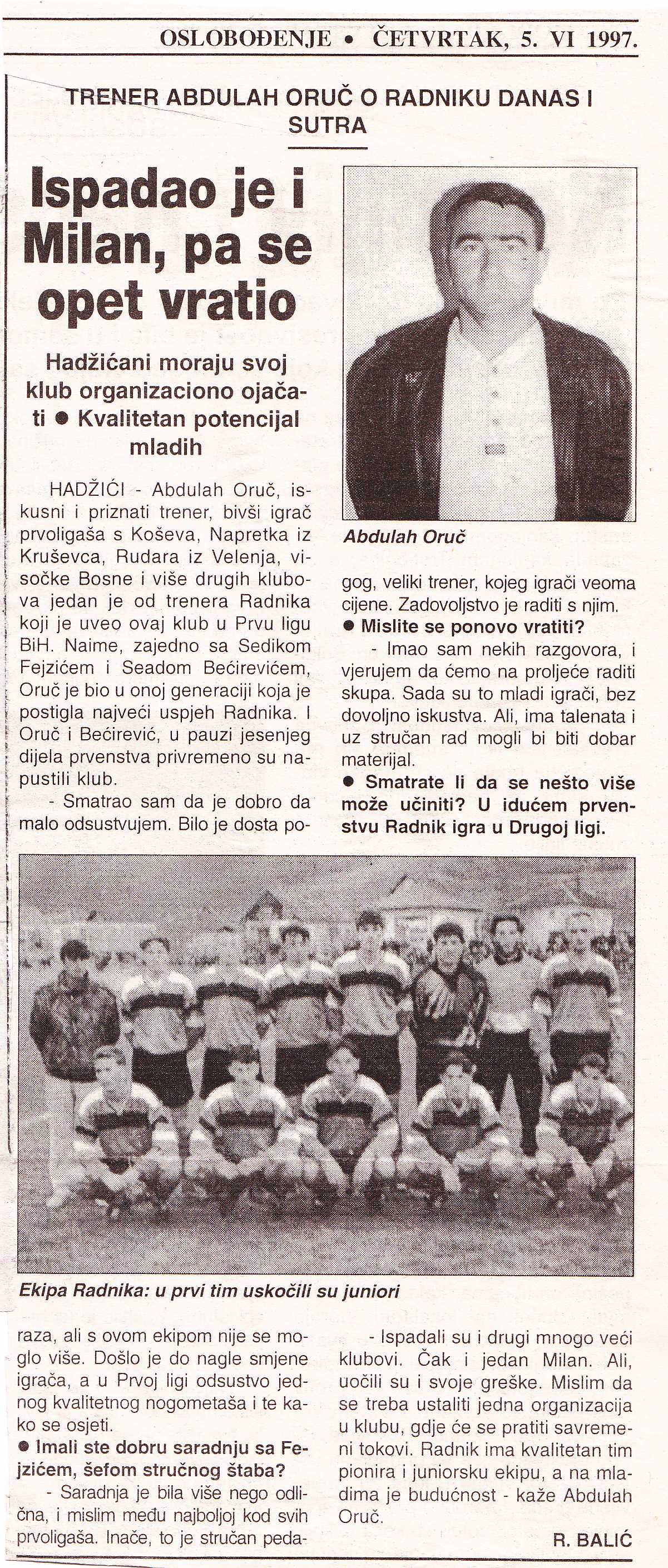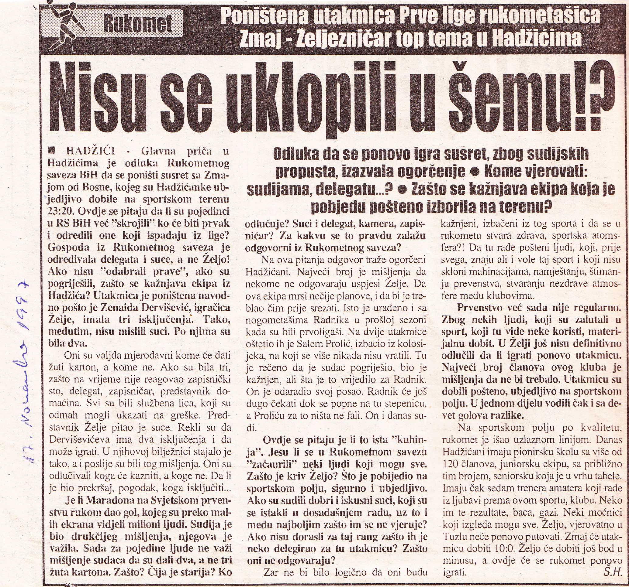 Nastavljamo s praksom prisjećanja na pisanje štampe o Hadžićima iz 1997. godine. Ovaj pu donosimo tekstove o FK Radnik – komentar sa iskusnim trenerom Abdulahom Oručem, pa tekst o poništenoj utakmici rukometašica Zmaja i Željezničara, te o rijeci Zujevini…