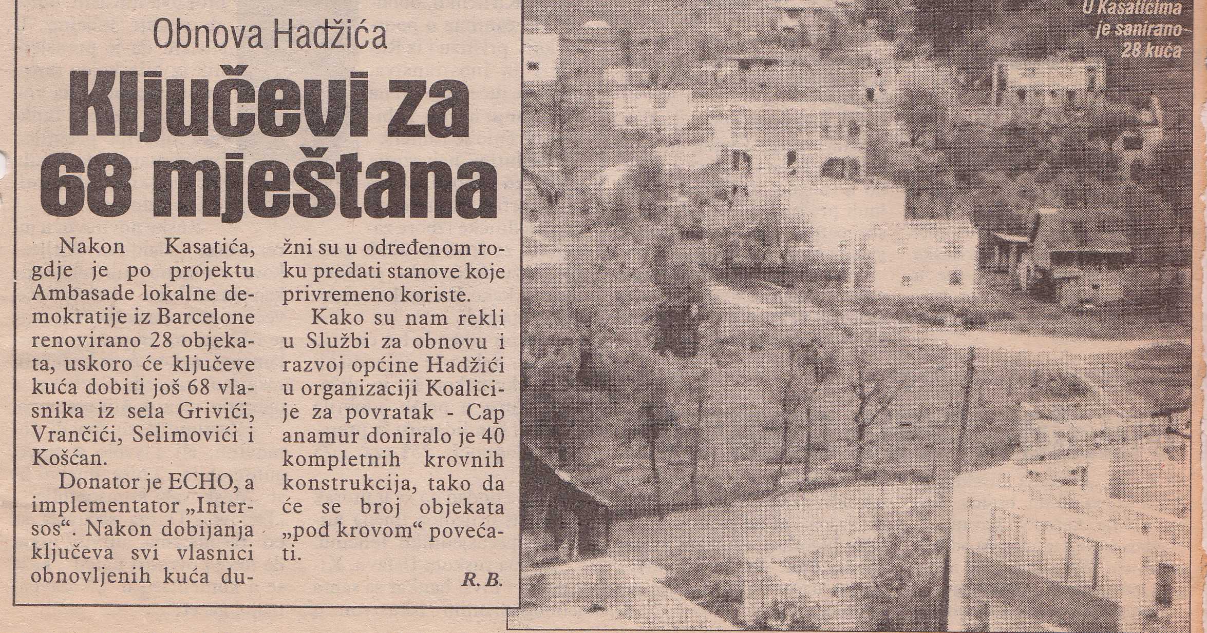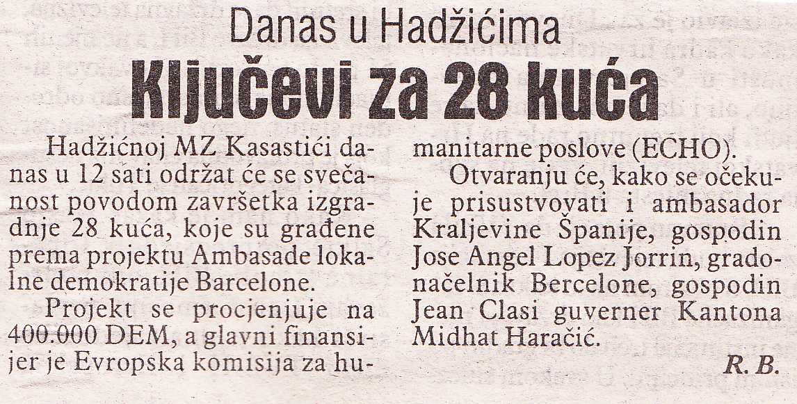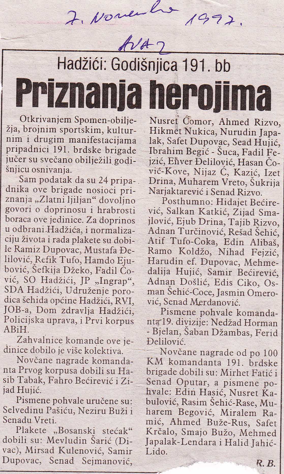 Nastavljamo s praksom prisjećanja na pisanje štampe o Hadžićima iz 1997. godine. Ovaj pu donosimo tekstove o priznanjima VELIKE 191. BRIGADE, dodjeli ključeva za kuće u Kasatićima,