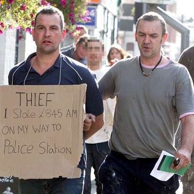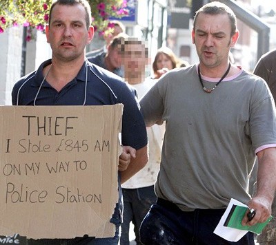 Britanac Mark Gilbert ukrao je od svog gazde Simona Cramera 845 funti. Naime, ovaj 40-godišnjak, otac troje djece, krivotvorio je ček na taj iznos i naplatio ga. Kada je gazda otkrio prevaru, uzeo je karton i flomaster i napisao: „Lopov. Na putu do policijske stanice ukrao sam 845 funti.“