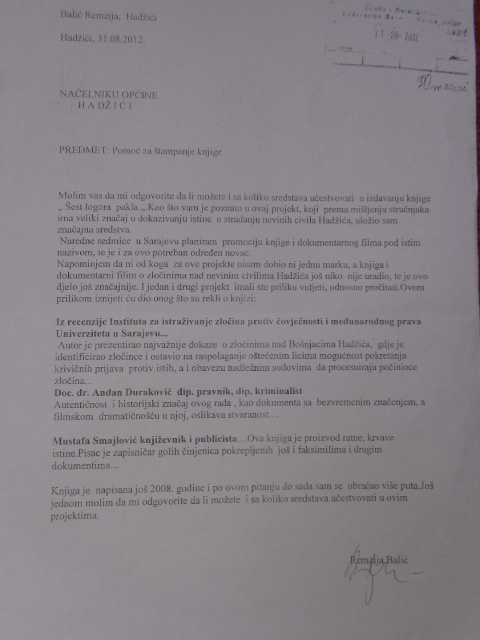 2006. godine od načelnika Općine pismeno sam tražio materijalnu potporu za dokumentarni film, a 2008. godine pismeno ga obavijestio da sam knjigu završio i pitao želi li Općina biti izdavač? I sa koliko sredstava želili novčano pomoći !? Na to , a biće tu i mnogi drugi zahtjevi , nisam dobio odgovor. Posljednji dopis poslao sam 31.08.2012. ali odgovor nikada nisam dobio. Usmeno mi je obećano da će novačno pomoći u izdavanju knjige.