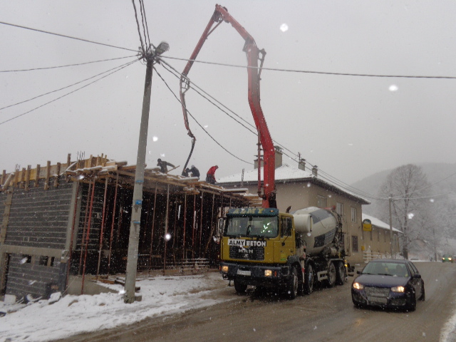 Da snijeg, loše vrijeme i minusi ne smetaju da se završi započeti posao, najbolje govori ova slika iz Tarčina. Krajem decembra, uz prvi snijeg, betonira se ploča stambene zgrade.Radnici kažu da zima jeste, ali da je prioritet završiti posao i platu dobiti na vrijeme.