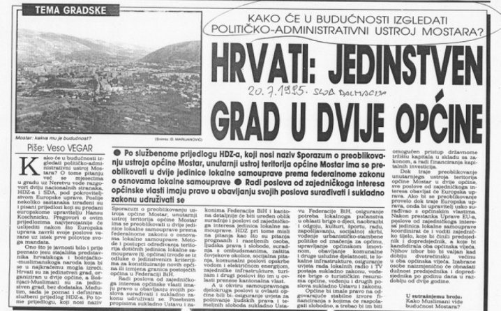 Potvrđuje to i arhiv “Slobodne Dalmacije”. Godina je 1995., u svom tekstu Veso Vegar piše: “Ono što je javnosti bilo i prije poznato jesu stajališta predstavnika hrvatskoga i bošnjačko-muslimanskoga naroda koja bi se u najkraćemu mogla izreći: Hrvati su za jedinstveni grad, organiziran u dvije općine, a Bošnjaci-Muslimani su za jedinstven grad, bez dodataka”.