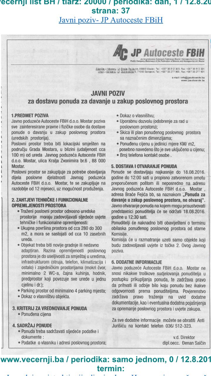 Tako je prošle sedmice u dnevnim novinama Večernji list i Dnevni avaz objavljen javni poziv za nabavku uredskih kancelarija u Mostaru koje trebaju biti udaljene maksimalno 100 metara od ulice Kralja Zvonimira. Oglas je objavljen 12. i 13. avgusta, a otvoren je do 18. avgusta.