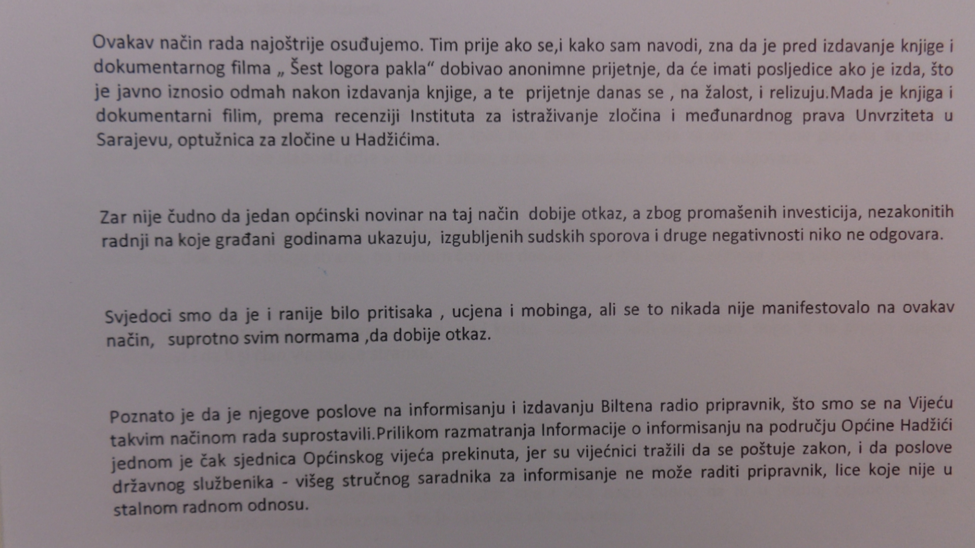 Faksimil:Prvo pismo OOSDP-a Hadžići u kojem osuđuju mobing i daju punu podršku izdavanju knjige „Šest logora pakla“