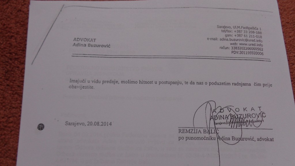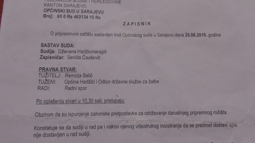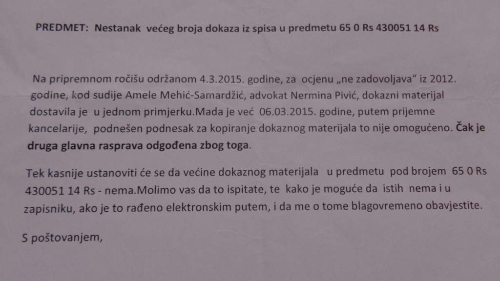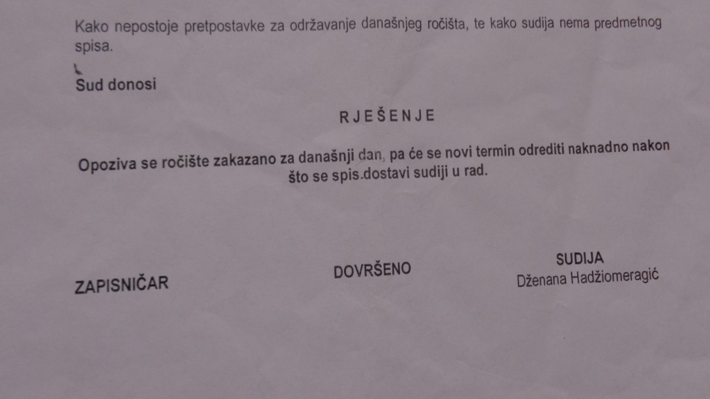 Međutim, jedan drugi predmet kompletno je nestao iz suda, a kojeg sam morao dobiti, tako da je do pronalaska predmeta dalja rasprava odgođena…Sudija Dženana Hadžiomeragić je istakla da će me obavjestiti čim se predmet pronađe. Od 25.8.2016. godine, još uvijek nema bilo kakve obavjesti….