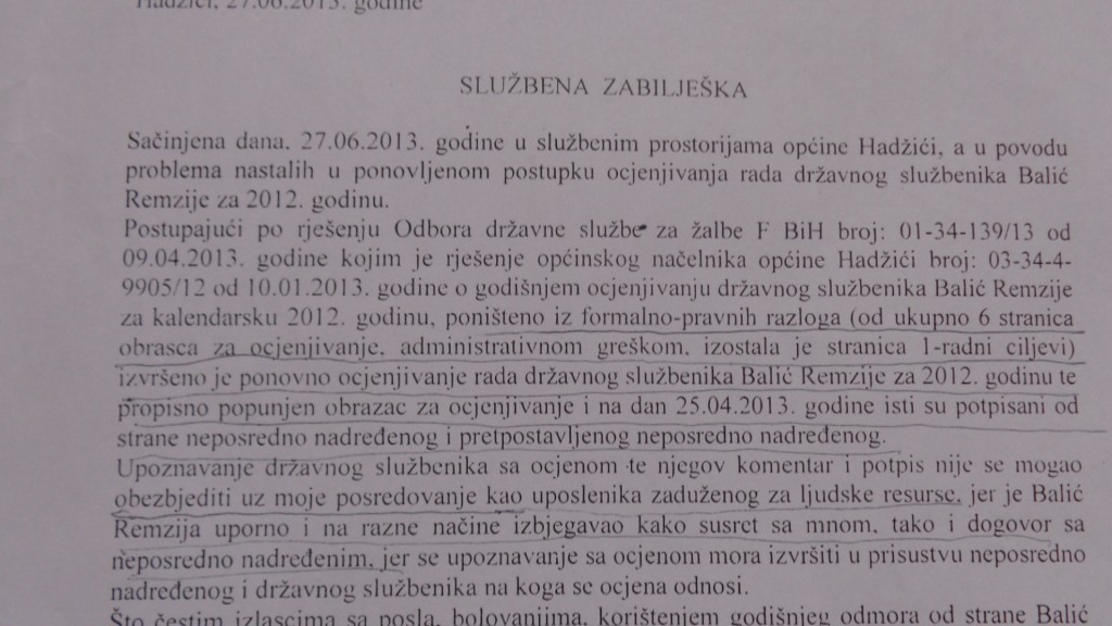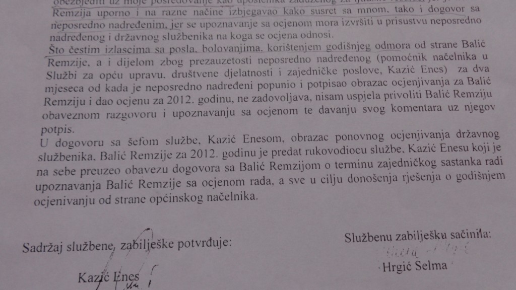 Dalje kažu, da upoznavanje državnog službenika sa ocjenom te njegov komentar i potpis nije bio moguć od 9. 04. 2013. godine, kada je Odbor državne službe poništio Rješenje, jer je Balić Remzija , kako piše Selma Hrgić,uporno izbjegavao kako susret sa mnom tako i dogovor sa neposredno nadređenim ( Enesom Kazićem ).