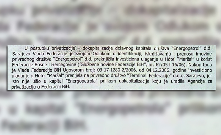– U postupku privatizacije – dokapitalizacije državnog kapitala društva Energopetrol Vlada FBiH je svojom odlukom o identifikaciji, isknjižavanju i prenosu imovine privrednog društva Energopetrol preknjižila investiciona ulaganja u Hotel Maršal u korist Federacije BiH. Nakon toga je Vlada FBiH ugovorom od 4. decembra 2006. investiciono ulaganje u hotel Maršal prenijela na privredno društvo Terminali FBiH (kompanija u vlasništvu Vlade FBiH op.a.), i isto nije ušlo u kapital Energopetrola prilikom dokapitalizacije (prodaje Ini op.a.) koju je uradila Agencija za privatizaciju FBiH – navodi se, između ostalog u informaciji o statusu hotela Maršal.