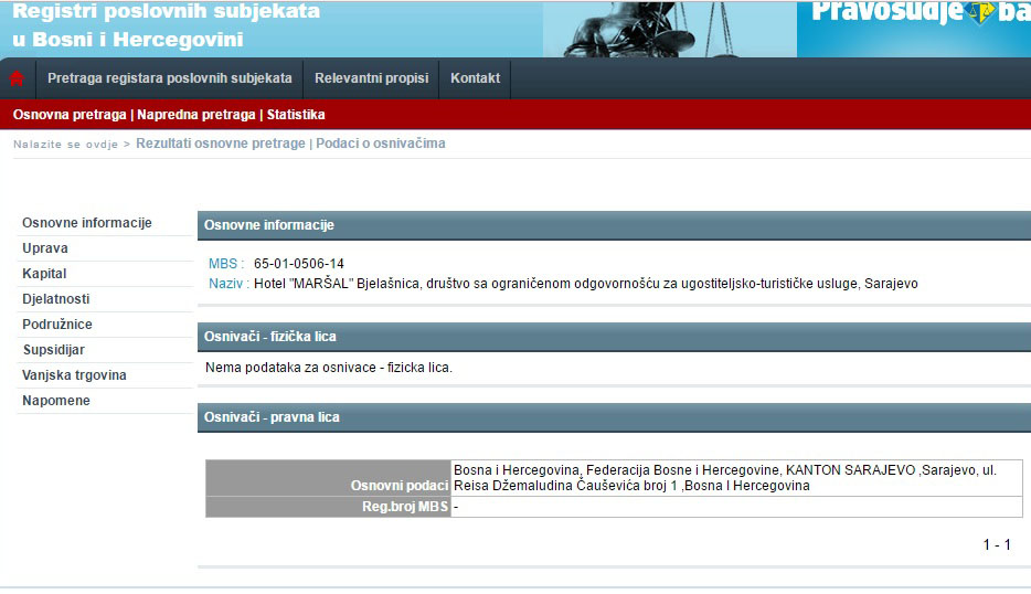 I u registru privrednih subjekata navodi se da su osnivači hotela Maršal Vlada FBiH i Kanton Sarajevo.