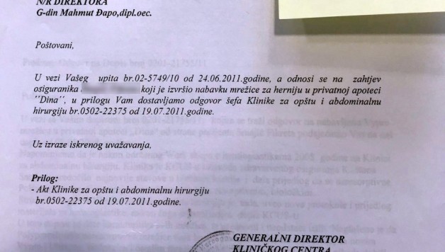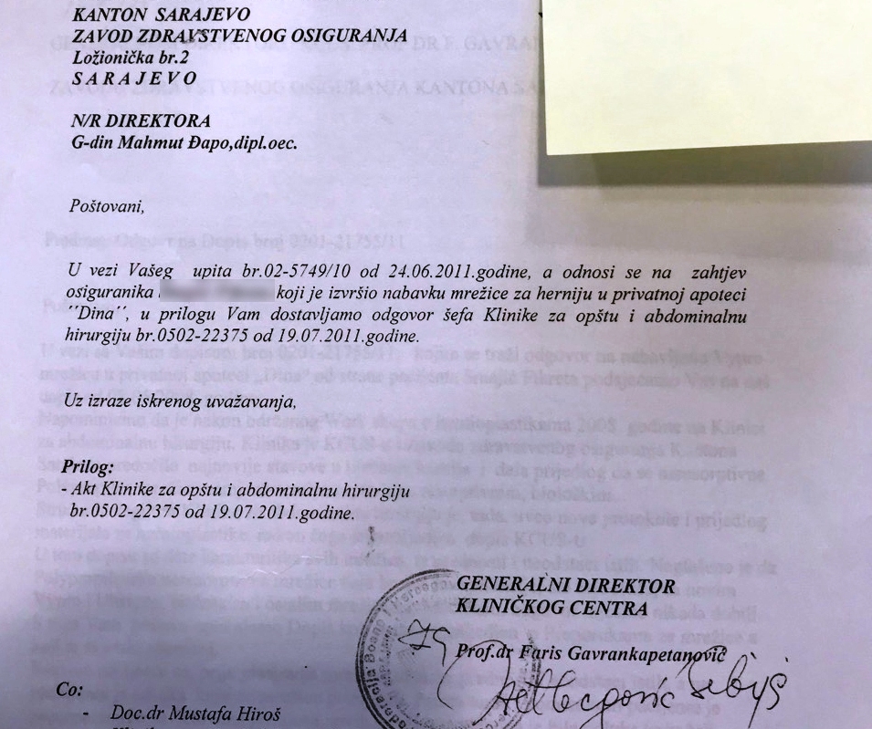 Tadašnji direktor KCUS-a bio je Faris Gavrankapetanović, a u njegovom odsustvu mijenjala ga je upravo Izetbegović. Ona je potpisala dokument kojim se pacijentu S.F. odobrava refundacija troškova za nabavku mrežice za herniju u privatnoj apoteci Dina. Tadašnji direktor ZZO KS bio je Mahmut Đapo. Dakle, dugogodišnja praksa nabavke materijala u privatnim apotekama i refundiranje troškova iz budžeta ZZO KS dobro je osmišljeni scenario kako bi pojedinci zaradili. Ista praksa nastavljena je i dok je Izetbegović bila na čelu Opće bolnice “Prim.dr. Abdulah Nakaš”.