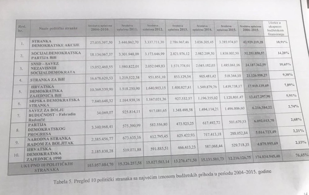 Rekorder u prisvajanju najviše novca iz državnog, entitetskih, kantonalnih i budžeta drugih jedinica lokalne uprave i samouprave je Stranka demokratske akcije. Od 2004. do 2015. godine isplaćeno im je 42 miliona maraka! Na drugom mjestu nalazi se SDP kojima je u istom periodu isplaćeno nešto više od 32 miliona maraka.