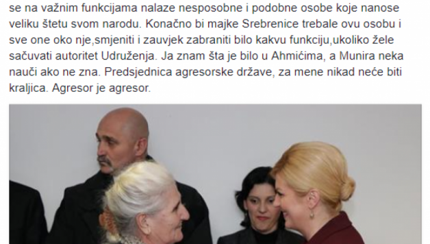 – Ja znam šta je bilo u Ahmićima, a Munira neka nauči ako ne zna. Predsjednica agresorske države, za mene nikad neće biti kraljica. Agresor je agresor – zaključio je Cvrk.