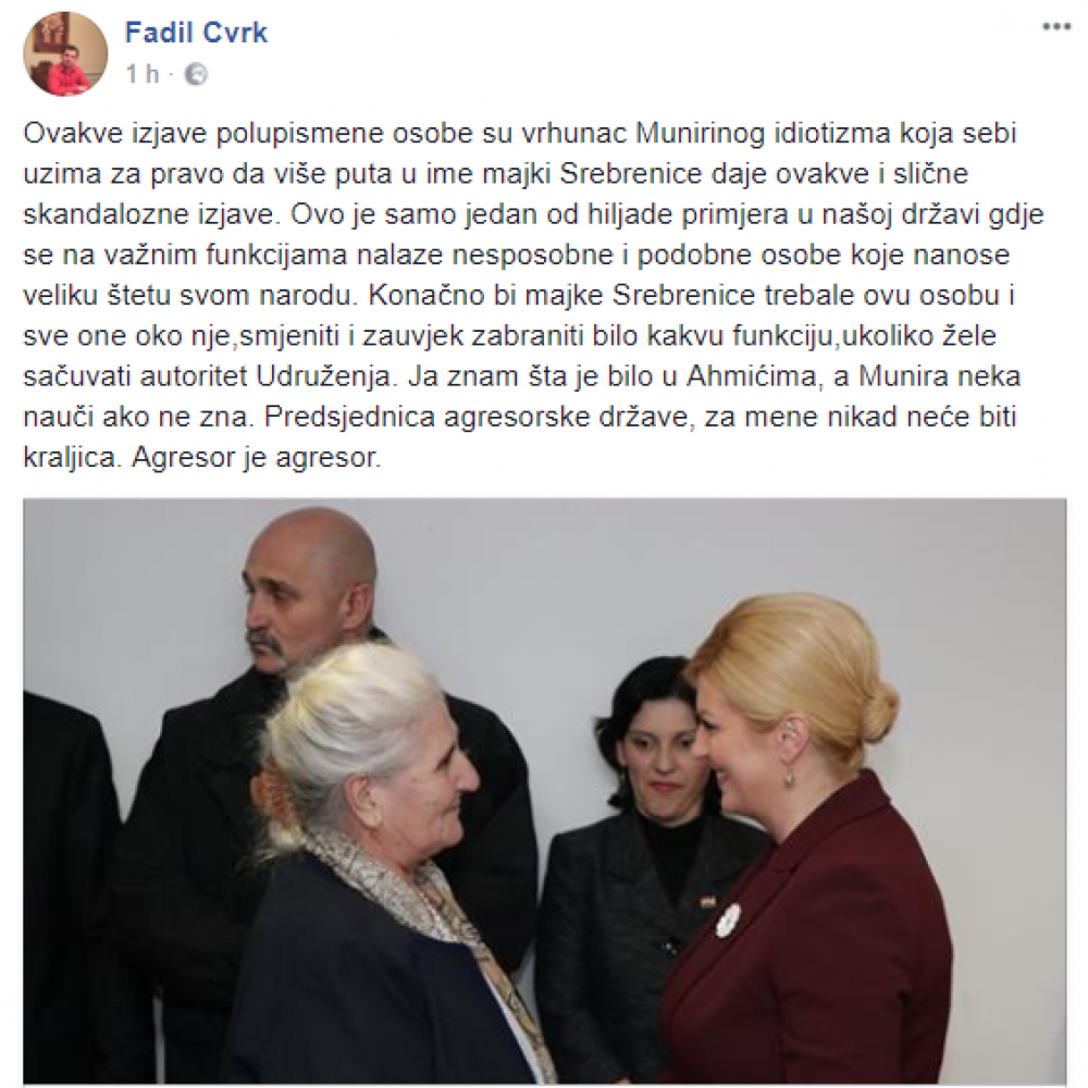 – Kao preživjeli srebreničkog genocida, uzimam sebi za pravo da javno osudim današnju izjavu polupismene predsjednice Udruženja ‘Majke Srebrenice’ koja je više nego ikad ponizila ovo Udruženje i sve bošnjačke žrtve, posebno žrtve Ahmića. Poslije višegodišnjeg kompromitirajućeg rada i skandaloznih izjava, nazivajući kraljicom osobu koja ruši Ustavni poredak BiH, ovakva čobanica ne može više biti na čelu ovog Udruženja, i na osnovu žrtava genocida i ukazanog poštovanja čitavog svijeta, sticati materijalnu korist za sebe i one oko sebe. Ako ovo Udruženje nema snage i mehanizma da je smijeni, svi mi Srebreničani ma gdje bili, trebamo dići svoj glas i stati u kraj ovom bezobrazluku – napisao je Cvrk na svom Facebook profilu.