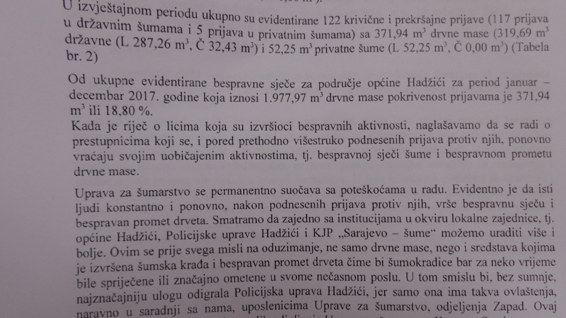 Tako u informaciji ponovo piše, citiramo: „Smatramo da zajedno sa institucijama u okviru lokalne zajednice, to jest Općine Hadžići,Policijske uprave Hadžići i KJP „Sarajevo-Šume“, možemo uraditi više i bolje. Ovim se prije svega misli na oduzimanje, ne samo drvne mase, nego i sredstva sa kojima je izvršena šumaska krađa, i bespravni promet drveta, čime bi šumokradice bar za neko vrijeme bili spriječeni ili značajno ometane u ovom nečasnom poslu…..“