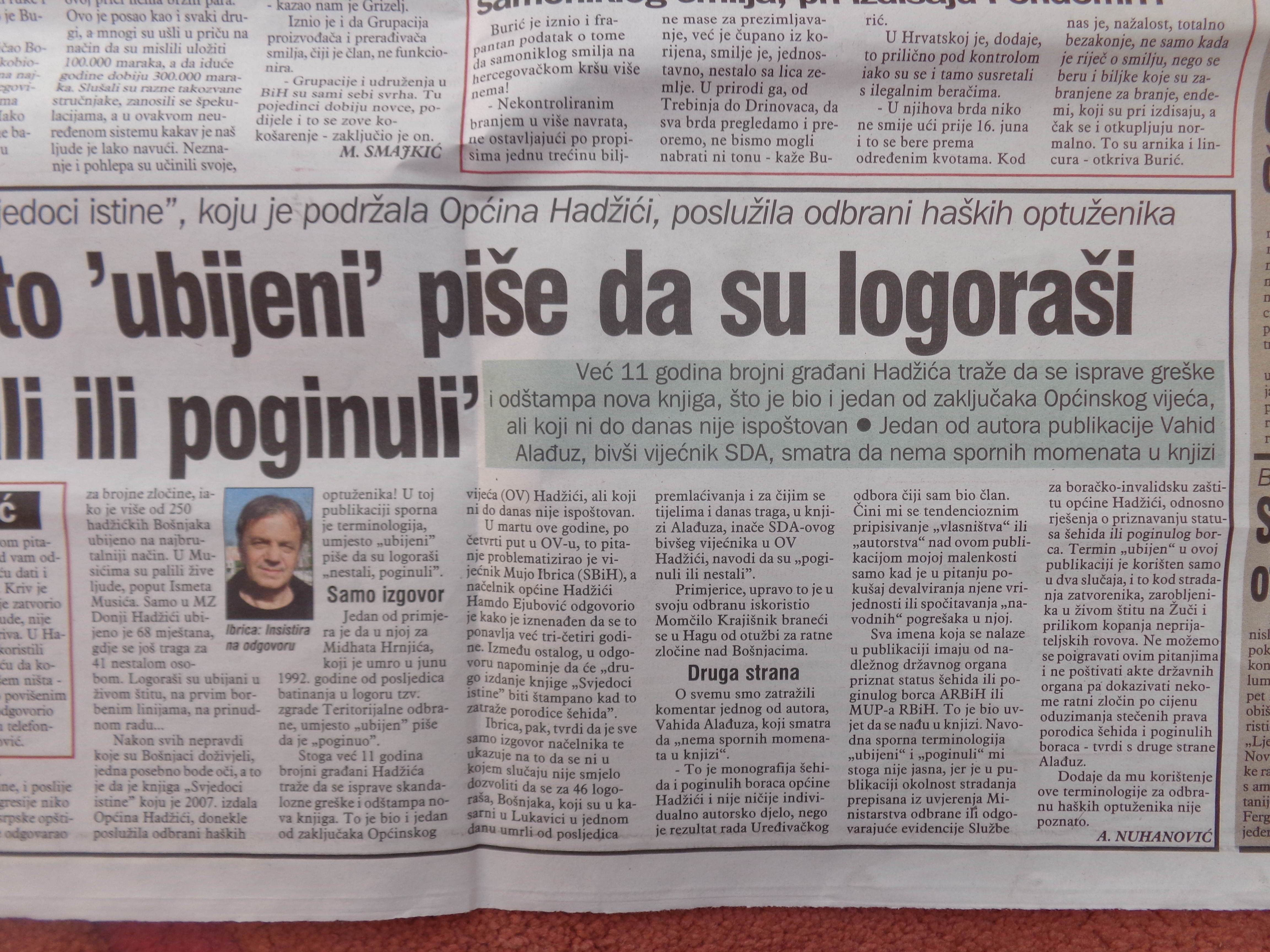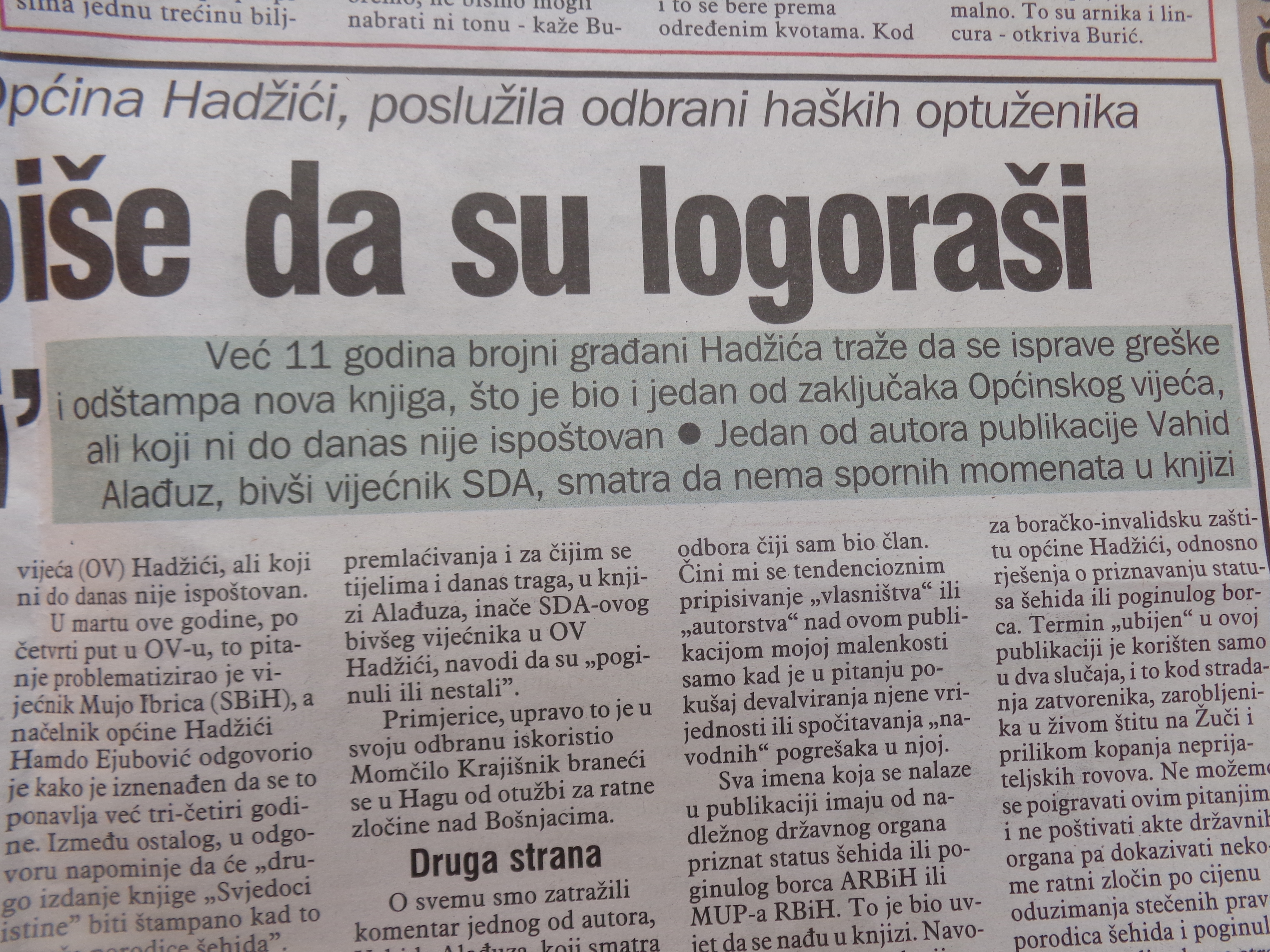 Već 11 godina brojni građani Hadžića traže da se isprave greške i odštampa nova knjiga, što je bio jedan od zaključaka Općinskog vijeća, ali koji ni do danas nije ispoštovan.Jedan od autora publikacije Vahid Alađuz, bivši vijećnik SDA, smatra da nema spornih momenata u knjizi. Završen citat.Znači li to da je „istina“ da nije bilo logora, mučenja, ubijanja…?