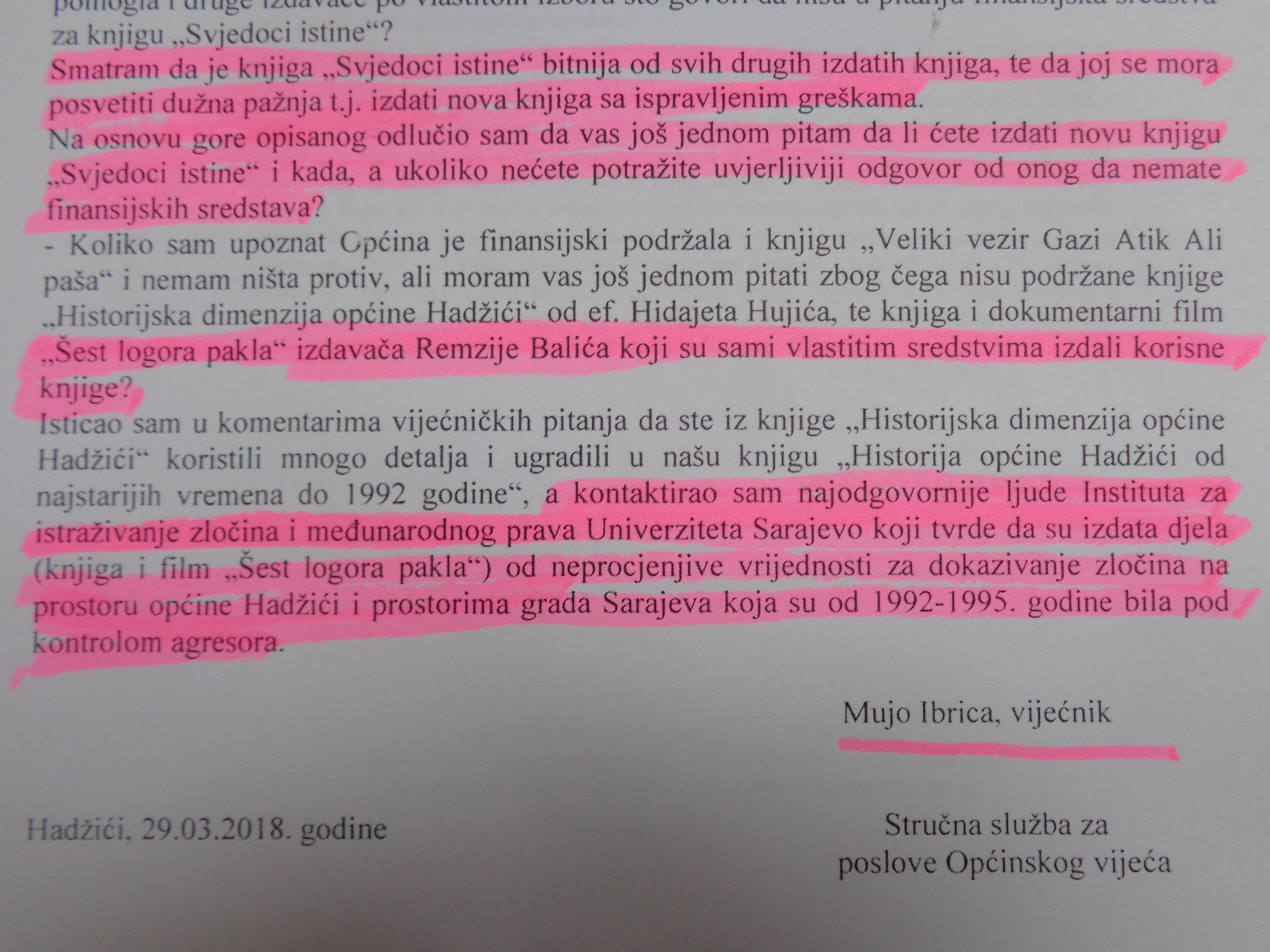 Interesantno je da su odgovori uvijek različiti.Prvi put su kazali da će se greške iz knjige Općine Hadžići ispraviti i štampati nova .Kada su nakon dužeg perioda ti isti vijećnici pitali zašto se to ne učini kazali su da nemaju para. Sada kažu da im za to treba saglasnost udruženja porodica šehida….