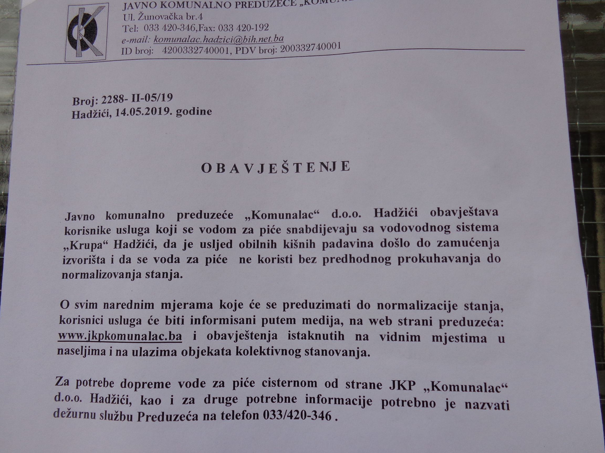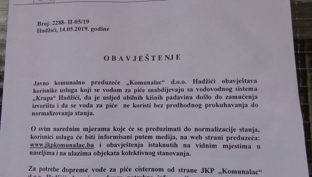 U Hadžićima ponovo zamućeno izvorište Krupa, odakle se pitkom vodom snadbjeva najveći dio stanovnika ove općine. Iz KRO „Komunalac“ ponovo upozoravaju građane da vodu za piće ne koriste bez predhodnog prokuhavanja.