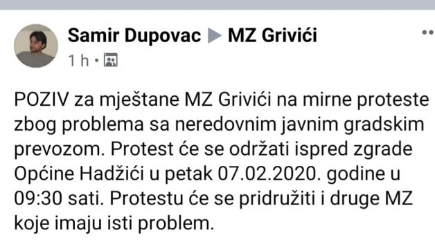 Da bi nadležne posjetili da se ozbiljnije pozabave ovim problem preko društvenih mreža iz MZ Grivići za petak u 9,30 sati, ispred zgarde općine, najavili su mirne proteste. Protestima će se, kako se kaže u dopisu, pridržužiti građani iz drugim mjesnih zajednica koji imaju isti problem.