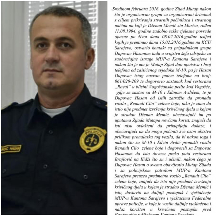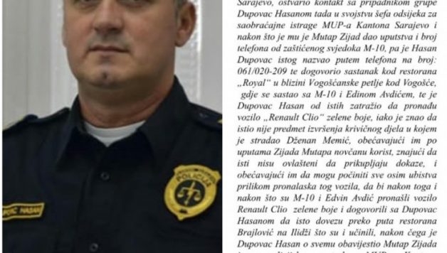 – Dupovac je od istih (zaštićenog svjedoka M-10 i Edina Avdića, op. a.) zatražio da pronađu vozilo Renault Clio zelene boje, iako je znao da nije predmet izvršenja krivičnog djela u kojem je stradao Dženan Memić, obećavajući im, prema uputama Zijada Mutapa, novčanu korist, znajući da isti nisu ovlašteni da prikupljaju dokaze i obećavajući im da mogu počiniti sve osim ubistva prilikom pronalaska tog vozila – navedeno je, između ostalog, u optužnici.