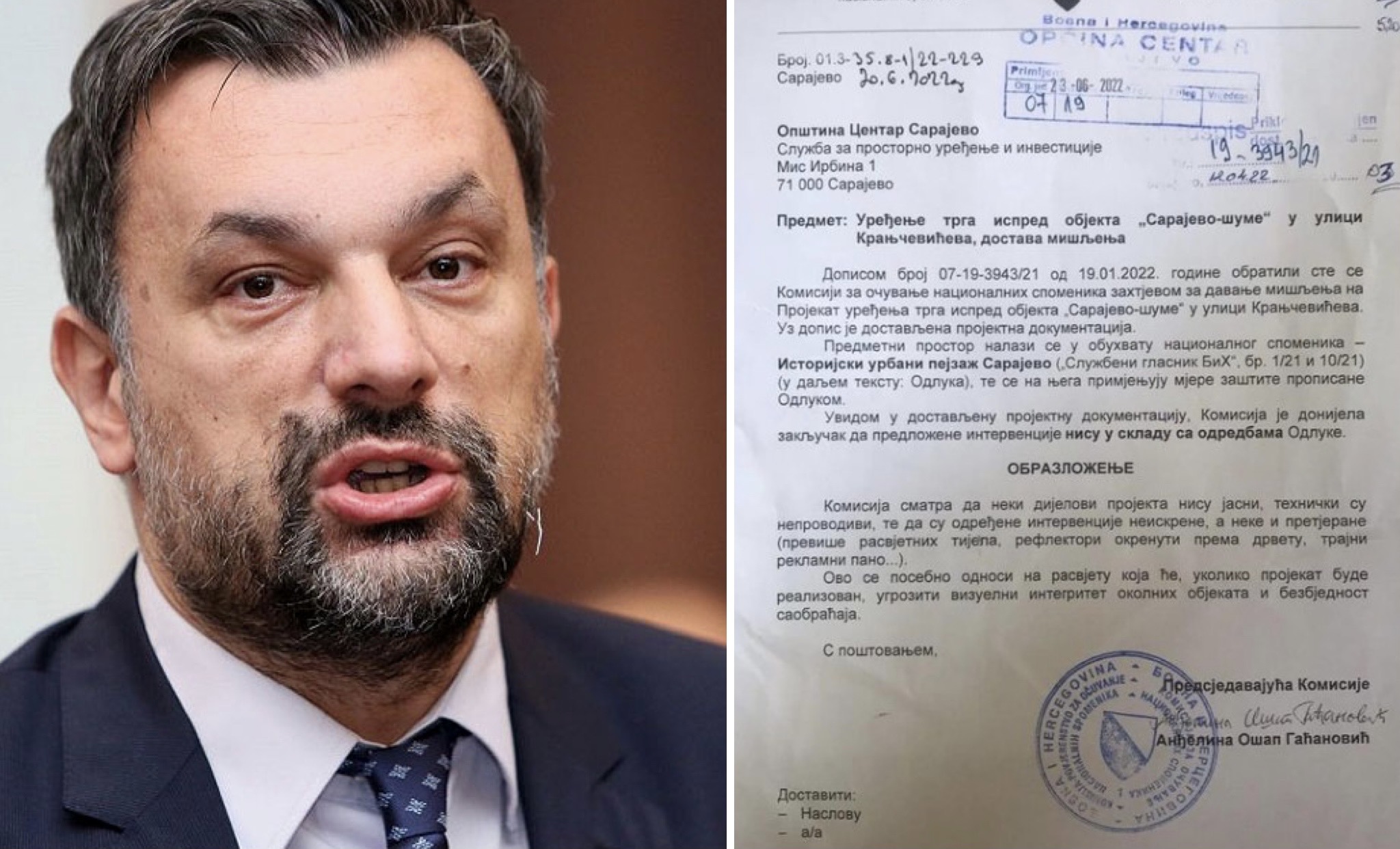 Lider Naroda i Pravde Elmedin Konaković na svom je Facebook profilu reagovao na odluku Komisije za očuvanje nacionalnih spomenika BiH da ne da dozvolu za uređivanje trga ispred objekta “Sarajevo šume”. Konaković je za ovu situaciju optužio SDA za koju kaže da je predala glavni gad BiH u ruke SNSD i HDZ kadrova koji blokiraju većinu odluka o gradnji.