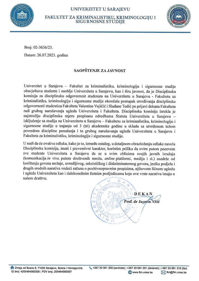 Fakultet za kriminalistiku, kriminologiju i sigurnosne studije UNSA izdao je saopćenje u kojem je obavijestio studente i uposlenike Univerziteta u Sarajevu, te širu javnost da je Disciplinska komisija za disciplinsku odgovomost studenata na Univerzitetu u Sarajevu – Fakultetu za kriminalistiku, kriminologiju i sigurnosne studije okončala postupak utvrđivanja disciplinske odgovornosti studentica Fakulteta Valentine Vujičić i Slađane Todić po prijavi dekana Fakulteta, kako navode, radi grubog narušavanja ugleda Univerziteta i Fakulteta.