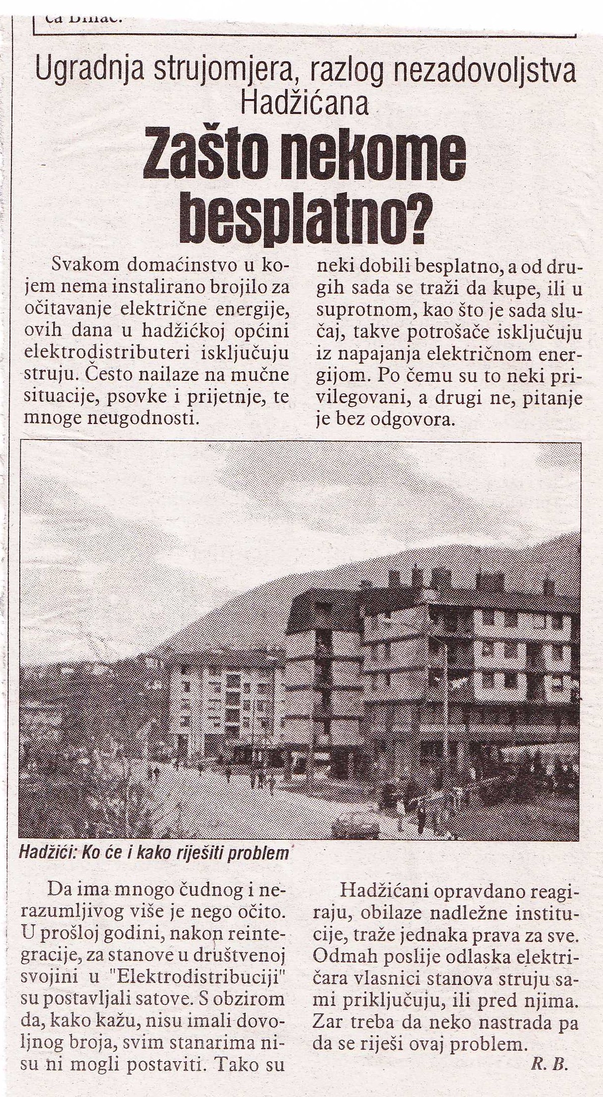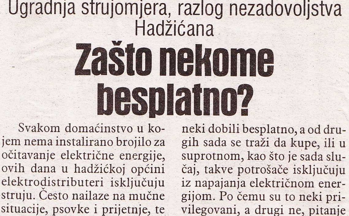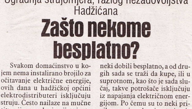 Prisjetićemo se 1997. godine kada je bila aktuelna ugradnja strujomjera u obnovljenim Hadžićima i teksta objavljenog u štampi…