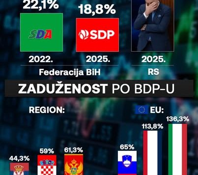 “Smanjili smo dug FBiH i gotovo uduplali izdvajanja prema svim kategorijama društva”, navode iz SDP-a, upoređujući podatke sadašnje i prethodne vlasti: FBiH 22,06 posto BDP-a koliko je bilo 2022. naspram 18,8 posto koliko je iznosio 2025. godine.
