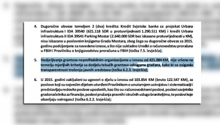 Finansijski izvještaj Grada Mostara ne prikazuju istinito stanje imovine i obveza Grada Mostara na dan 31. decembra 2015. godine, ne prikazuje istinito poslovanje kao ni tok novca Grada. Navodi se ovo u izvještaju Ureda za...