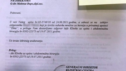 Sebija Izetbegović potpisala dokument umjesto Gavrankapetanovića Apoteka Dina u vlasništvu Elvedine i Jasmina Kapetanovića, bliskih prijatelja direktorice KCUS-a Sebije Izetbegović još 2011. godine bila je jedna od protežiranih apoteka u koju su se slali pacijenti KCUS-a...